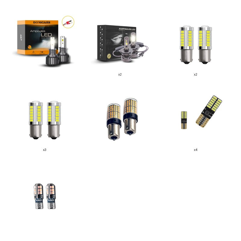 Abblendlicht, Fernlicht, Positionsleuchten, Nebelscheinwerfer, Blinker vorn, Seitenblinker, Blinker hinten, Rückfahrscheinwerfer, Nebelschlussleuchten, Kennzeichenbeleuchtung, Positionsleuchten hinten, Bremsleuchten, Bremsleuchten (Mitte), Innenraumbeleuchtung
