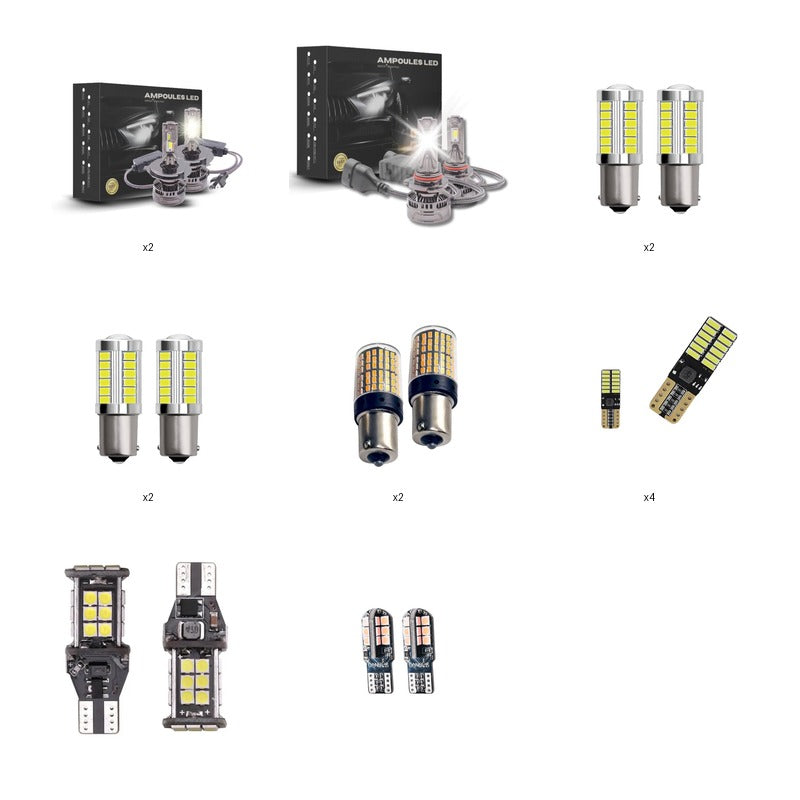 Feux de croisement, Feux de route, Feu de position, Antibrouillard avant, Clignotant avant, Clignotant latéral, Clignotant arrière, Feu de recul, Feu antibrouillard arrière, Éclairage de plaque d'immatriculation, Feu de position arrière, Feu stop, feu stop central, Plafonnier (intérieur), Éclairage de coffre