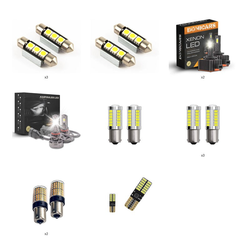 Feux de croisement, Feux de route, Feu de position, Antibrouillard avant, Clignotant avant, Clignotant arrière, Feu de recul, Feu antibrouillard arrière, Éclairage de plaque d'immatriculation, Feu de position arrière, Feu stop, Éclairage de coffre, Éclairage boîte à gants, Éclairage de bas de porte/pieds