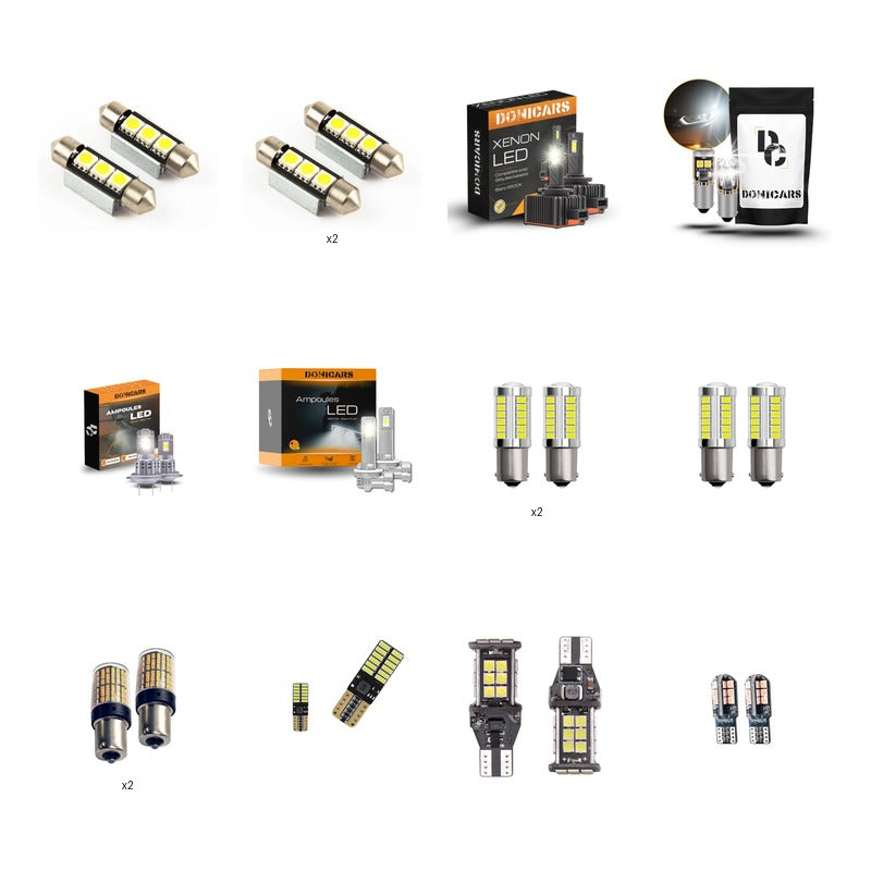 Feux de croisement, Feux de route, Feu de position, Antibrouillard avant, Clignotant avant, Clignotant latéral, Clignotant arrière, Feu de recul, Feu antibrouillard arrière, Éclairage de plaque d'immatriculation, Feu de position arrière, Feu stop, Plafonnier (intérieur), Éclairage de coffre, Éclairage boîte à gants